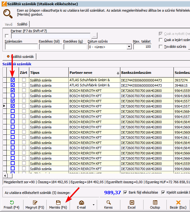 Válasszuk ki hogy melyik számlákat szeretnénk utalásra előkészíteni, utána Mentés: