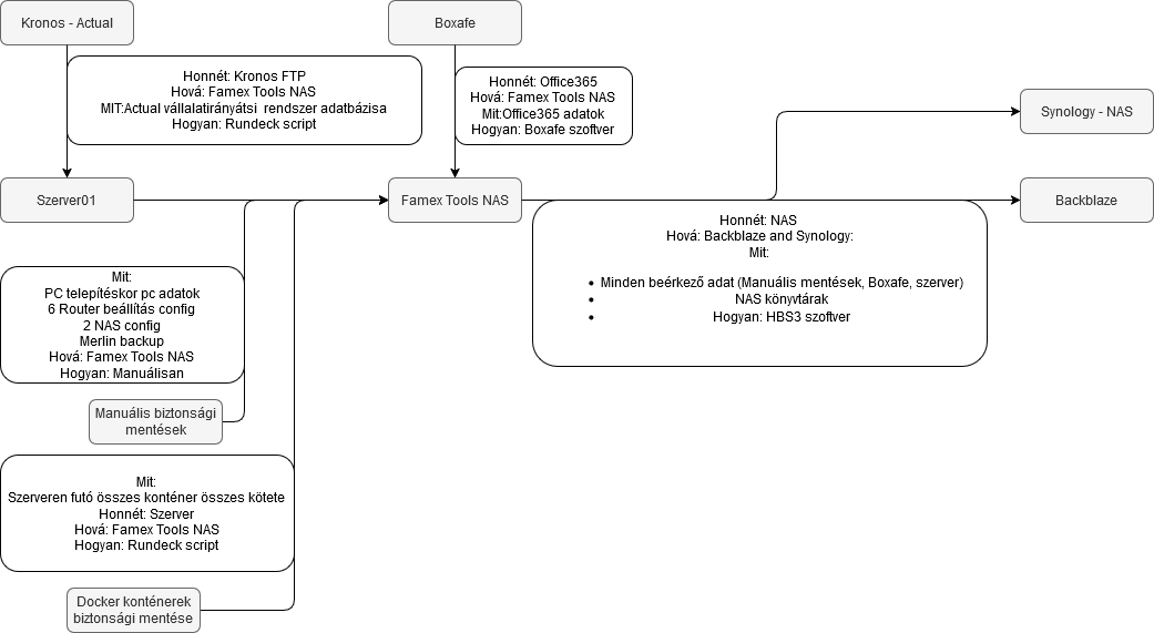 A Famex Tools Kft. biztonsági mentési folyamata többszintű megoldást kínál (NAS, felhő, on-premises). A mellékelt szkriptek és monitorozási megoldások révén folyamatos felügyelet és riasztás áll rendelkezésre. A folyamat megfelel az ISO 27001 követelményeinek, biztosítva az adatok folyamatosságát, integritását és biztonságát.